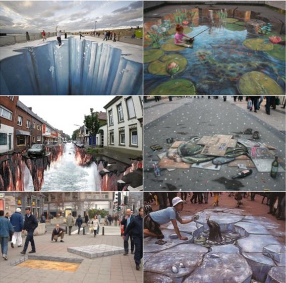 이 입체 그림들은 마치 실제 같아 그림위를 지나가는 행인들을 착각을 일으키게 만든다.