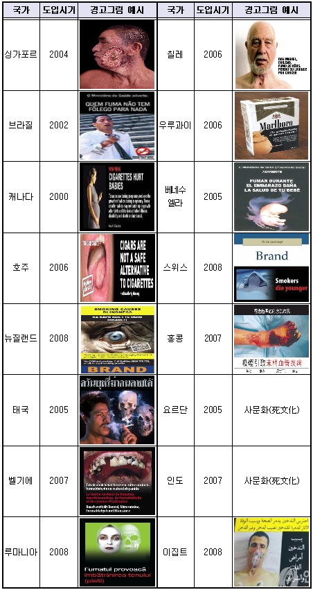 복지부 조사에 따르면 현재 브라질, 캐나다, 홍콩, 싱가포르 등 세계 23개국에서 담뱃갑에 ‘구멍 난 목’, ‘검게 변한 폐’ 등 한 눈에 봐도 끔찍한 흡연 경고 그림을 넣었거나, 삽입할 예정이다.
