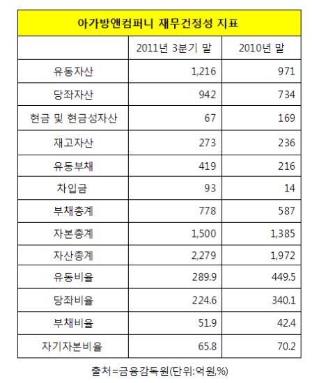 아가방앤컴퍼니의 유동비율은 2010년 말 499.5%에서 2011년3분기 말 289.9%로 떨어졌다. 이 기간 동안 유동부채가 무려 2배 가까이 불어나면서 기업의 재무유동성을 나타내는 대표적 항목인 유동비율이 대폭 하락한 것. 종전부터 워낙 높은 유동비율을 갖고 있던 점을 감안하더라도 단기간 하락폭이 상당한 수준이다.