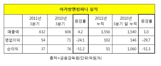 지난 3분기 아가방앤컴퍼니 매출액은 632억원으로 전년동기대비 4.2% 증가에 머물렀다. 반면 영업이익은 54억원으로 24.1% 하락했다. 순이익은 37억원으로 무려 51.2% 줄어들었다.