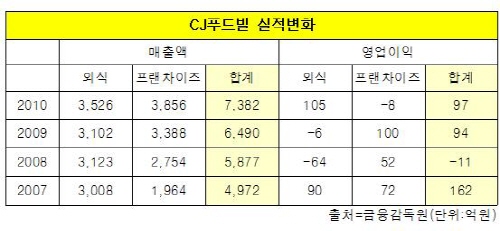 CJ푸드빌은 2010년 총 매출액 7천382억원, 영업이익 97억원을 달성했다. 빕스와 뚜레주르는 각각 외식부문과 프랜차이즈부문의 주력 브랜드다.
