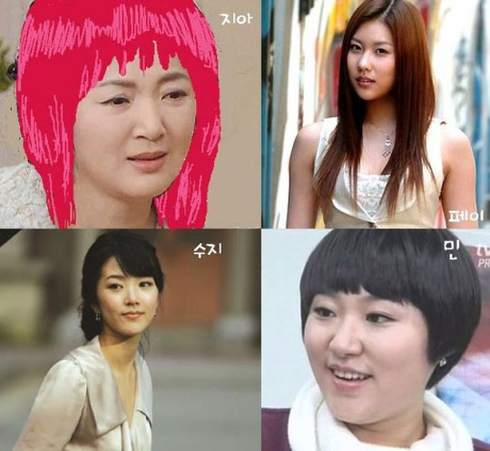 신개념 미쓰에이 사진에는 지아를 닮은 배우 권은아, 페이를 닮은 가수 스테파니, 수지를 닮은 배우 배슬기, 민을 닮은 개그우먼 김현숙의 사진이 담겨있어 보는이의 웃음을 자아내고있다.