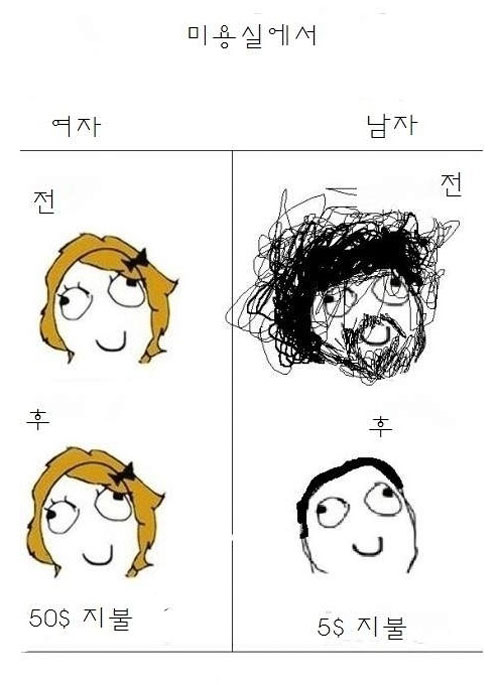 28일 해외의 한 온라인 사이트에 올라온 그림에 따르면 미용실에 다녀온 남자와 여자가 비용을 비롯해 외모변화까지도 큰 차이를 보였다.