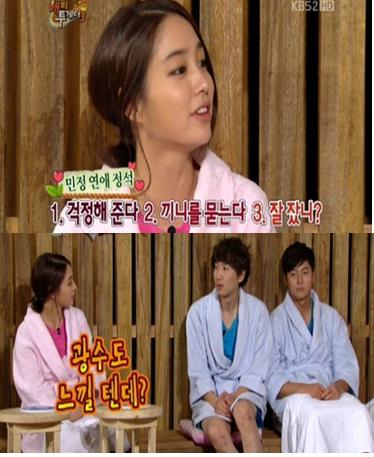 이민정은 이어 “눈 여겨 보는 연예인이 있느냐”라는 질문에는 “많다. 하지만 말 할 수 없어요”라며 애교를 부려 남성들의 마음을 녹이기도 했다. (사진-KBS 방송 캡처)