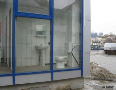 세면대, 거울, 변기 등 완벽한 화장실의 모습을 갖췄지만 정작 벽은 외부에서 들여다보이는 유리로 되어있어 네티즌들의 궁금증을 자아낸다.