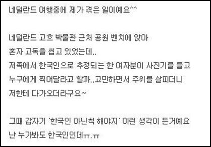 최근 한 온라인 커뮤니티에는 '한국인 아닌 척하다가'라는 제목의 게시물이 게재됐다. 이 게시자는 "네델란드 여행 중에 제가 겪은 일"이라고 서문을 시작했다.