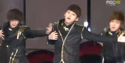 비스트 '픽션' 무대에서도 멤버들이 초반 박자를 놓치는 사고가 벌어졌다.(엠블랙 음향 사고 사진-MBC방송 캡처)