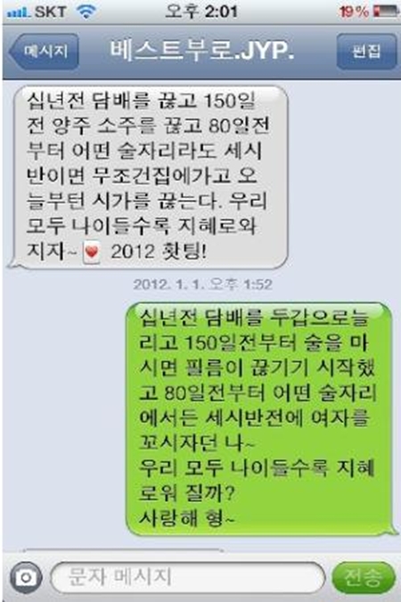 박진영은 길에게 "10년 전 담배를 끊고 150일 전 양주 소주를 끊고, 80일 전부터 어떤 술자리라도 3시 반이면 무조건 집에 가고 오늘부터는 시가를 끊는다. 우리 모두 나이들수록 지혜로워지자"라고 문자를 보냈다. 이에 길은 "10년 전 담배를 두 갑으로 늘리고, 150일 전부터 술을 마시면 필름이 끊기기 시작했고 80일 전부터 어떤 술자리에서든 3시 반 전에 여자를 꼬시자던. 우리 모두 나이들수록 지혜로워질까? 사랑해 형"이라고 답했다.