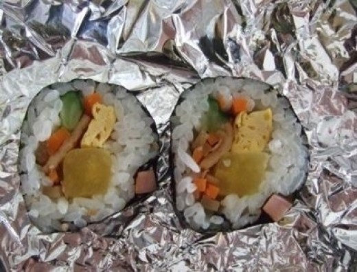 마치 김밥 재료들 틈에서 햄이 왕따가 된 듯해 보인다.