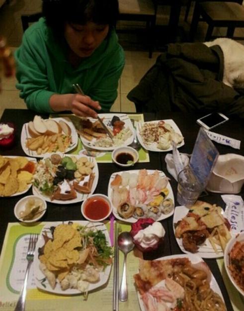 공개된 사진에서 권미진은 초밥, 피자, 과자 등이 잔뜩 차려진 밥상에서 음식을 먹고 있다.