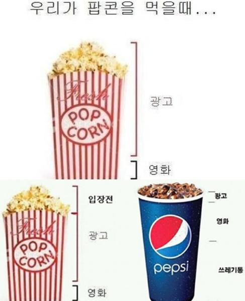 이 게시물에는 팝콘 표시선의 80%는 영화시작 전 광고 시간에 먹게 된다는 재밌는 내용이 담겨 있다.