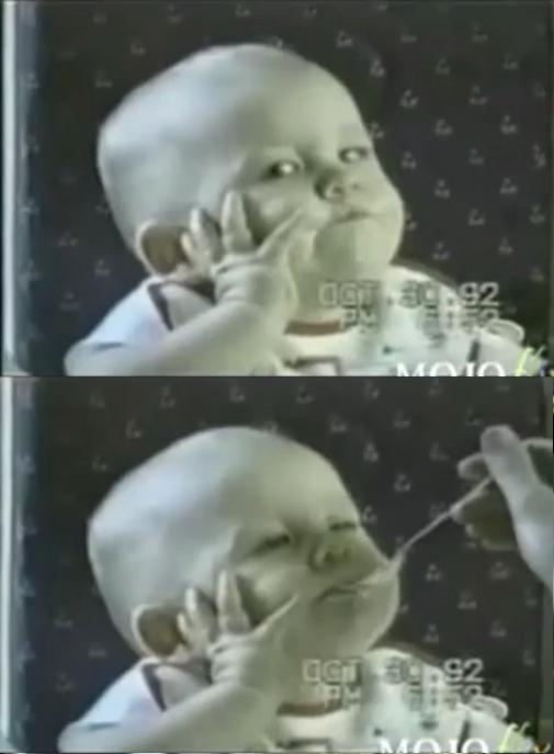 홈비디오로 보이는 영상 속에는 손을 괸 채 누군가가 떠 먹여주는 밥을 받아먹고 있는 아기의 모습이 담겨 있다.