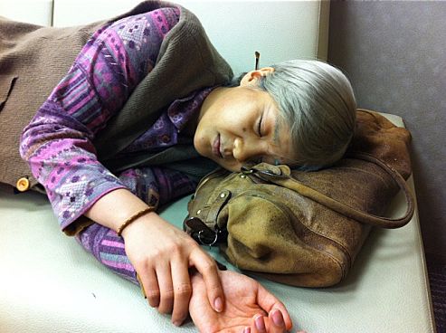 사진 속의 강유미는 최근 인기리에 방영중인 tvN'코미디 빅 리그2‘에서 열연중인 ‘얼짱 할매’ 분장을 그대로 한채 베개가 아닌 가방을 베고 자는 모습이다.