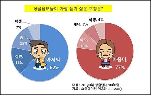 설문조사 결과에서 싱글남녀가 꼽은 최악의 호칭은 남성은 아저씨(62%), 여성은 아줌마(77%)가 1위를 차지했고 이어 삼촌(16%), 총각(15%), 이모(10%), 새댁(7%) 으로 나타났다.