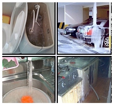 공개된 사진 속에는 주차장, 싱크대 등 여러 장소에서 물이 흘러내리다 그대로 얼어 버린 모습이 담겨 있어 보는 이들을 안타깝게 하고 있다.