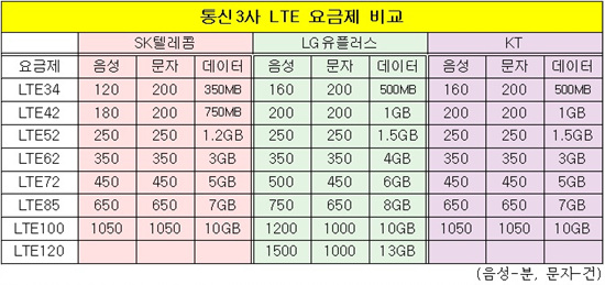 LTE 34 요금제의 경우 SK텔레콤은 120분의 음성과 350MB의 데이터를 제공하는 반면 LG유플러스와 KT는 160분의 음성과 500MB의 데이터를 제공한다. LTE 42 요금제에서는 음성 20분 데이터 300MB가 차이난다.