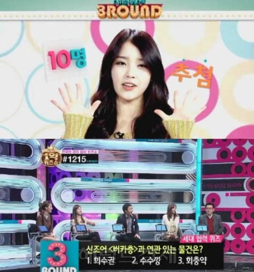이날 방송에서 3라운드 문제 출제자로 VCR을 통해 출연한 아이유는 “생선은 생일 선물의 줄임말이다. 또 문상은 문화 상품권 줄임말이다”며 “그렇다면 다음 중 버카충과 관련있는 물건은 무엇일까요? 1번 회수권, 2번 수수깡, 3번 회충약”이라고 전했다.