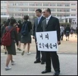 사진 속에는 한 여자고등학교 등교시간에 머리가 벗겨진 남자선생님이 '머리 있을때 묶어'라고 쓰인 팻말을 들고 복장을 계도하고 있다.