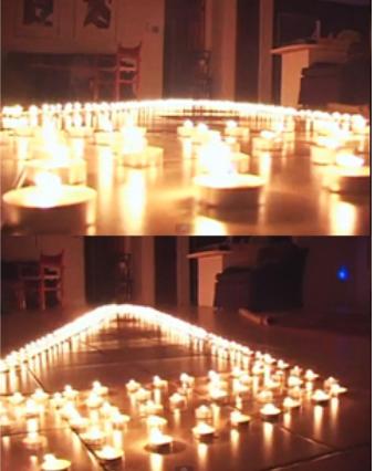 영상 속에는 수많은 양초가 켜져 있는 집안을 카메라 앵글로 잡아 양초들이 삼각형, 직육면체, 정육면체 등 입체적으로 변하는 장면이 담겨 있다. (사진-온라인 커뮤니티 영상 캡처)