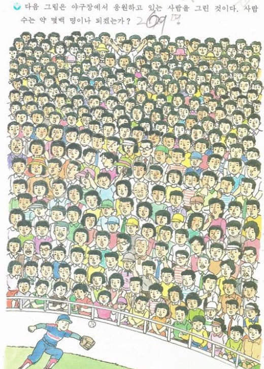 최근 한 온라인 커뮤니티 게시판에 올라온 수학문제 게시글이 눈길을 끌고 있다. '수학 사상 최고의 난이도'라는 제목의 게시물에는 초등학교 저학년용으로 보이는 교과서 한 면에 야구장을 찾은 관람객이 빼곡히 그려져 있는 그림과 '약 몇명일까요?'라는 문제가 게재돼 있다.