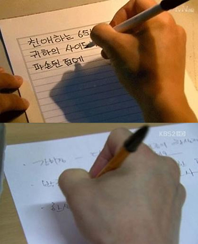 반면에 KBS 2TV 월화극 '브레인'에 등장한 신하균의 글씨체다. '브레인'에서 차갑고 빈틈없는 외과의사로 출연한 신하균은 캐릭터와 어울리는 글씨체를 선보였다.