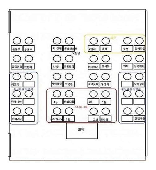 교탁 바로 앞 가운데 두 줄은 ‘스터디그룹’으로 1등과 반장 등 소위 우등생들의 자리임을 알 수 있다.
