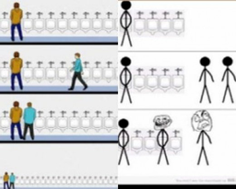 이어 두 번째 그림은 두 번째로 화장실에 들어온 남자가 이도저도 아닌 자리에 자리를 잡았기 때문에 세 번째 남자는 어느쪽 변기를 택하든 누군가의 옆자리에 가야만 하는 상황을 그렸다.
