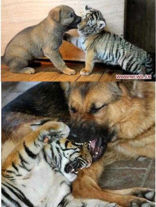 이 게시물은 새끼 호랑이가 강아지에게 물리고 있는 모습으로 1년 뒤에는 새끼 호랑이가 훌쩍 커 버려 강아지를 이길 것 같았지만 바로 뒷 사진에서도 호랑이는 개보다 작아 여전히 괴롭힘을 당하고 있다. 이 호랑이와 개의 반전 사진에 네티즌들은 뜨거운 반응을 보이고 있다.