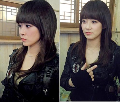 류현경은 사진에서 검은 가죽 재킷을 입고 권총집을 두른 채 인형미모를 뽐냈다.
