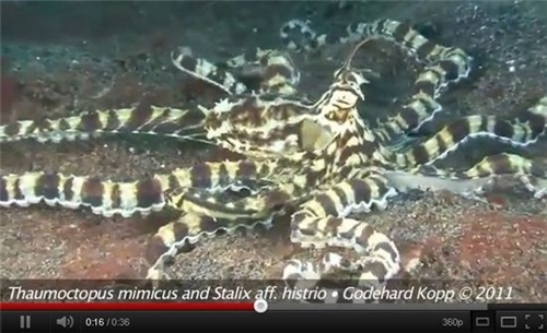 이 문어는 맹독성이 강한 해양생물과 비슷한 색을 띄고 있어 ‘흉내 문어'라고 불리고 있으며 ’색‘ 외에도 ’행동‘까지 똑같이 따라한다.