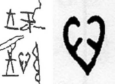 이는 기원전 1300~1192년 고대 중국의 은나라 반경시대의 문자로 당시 사람들이 점을 친 뒤 그 결과를 새겨넣은 갑골(거북이 등껍질)문이다. 말하자면 3300년 전 동양 최초의 이모티콘 ‘♡‘로 볼수있다