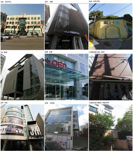 게시물에는 아이돌의 소속사 건물과 그에 대한 설명을 붙여 놓았다. 사진에서 SM엔터테인먼트는 동사무소, 큐브는 카페, DSP는 단독주택, LOEN은 은행, 코어는 고시원, JYP는 극장 등으로 건물의 특징을 포착해 표현했다.