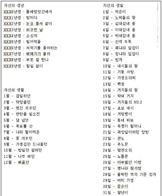 예를 들면 1984년 11월 5일이 생일이라면 '소싯적 나무 패던 박대감네 종'이 되는 것이다.