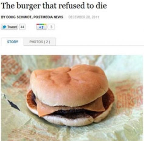 이 글을 올린 여성은 캐나다 온타리오에서 일하는 영양사로 그녀는 지난 2010년 12월 29일 한 패스트푸드점에서 치즈버거를 구입해 상온에 보관했지만 1년이 지나도 멀쩡하다고 주장했다.