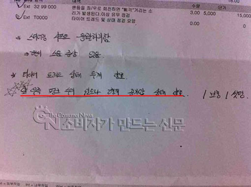 ▲ 앞 우측 펑크 수리 흔적이 있다고 명시된 수리확인서.
