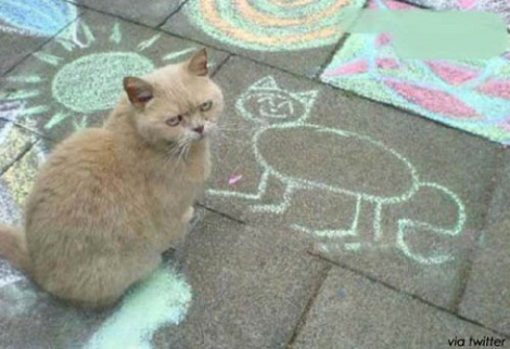 해외사이트를 통해 알려진 사진 속 고양이는 바닥에 그려진 자신의 초상화가 마음에 들지 않는지 심통 난 표정으로 카메라를 쳐다보고 있다.
