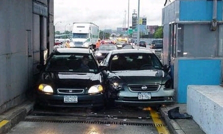 해당 사진은 해외에서 찍힌 사진으로 두 대의 차량이 톨게이트를 서로 먼저 빠져나가려다 벽 사이에 껴 오히려 오도 가도 못하는 상황을 보이고 있다.