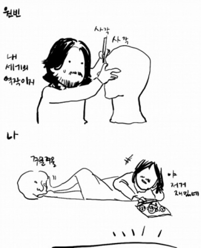 URL복사 기사공유하기 스크랩 프린트 메일보내기 글씨키우기 원빈과 내가 다른 이유를 담은 그림이 네티즌들 사이에서 큰 인기다.최근 한 온라인 커뮤니티 게시판에는 ‘원빈과 내가 다른 이유’라는 제목의 그림이 게재됐다.그림 속 조물주는 원빈을 만들 때는 “세기의 역작이지”라며 혼신의 힘을 다해 만들고 있지만 나를 만들 때는 TV를 시청하며 발로 ‘조물조물’거리며 대충 만들고 있다.(원빈과 내가 다른이유 사진-온라인 커뮤니티) 저작권자 © 소비자가 만드는 신문 무단전재 및 재배포 금지 온라인 뉴스팀 다른기사 보기 URL복사 기사공유하기 주요기사 고장 원인 못찾아 서비스센터 들락날락...반복 수리 피해는 소비자 몫 미래에셋·한투·삼성증권 등, 절세계좌 고객 유치 경쟁 치열 개포우성6차 재건축, GS건설-HDC현산 양강 경쟁으로 압축 정신아 카카오 대표 연임?...실적 '합격점', 이용자 신뢰 '낙제점' 삼성카드, 신용판매 점유율 2위 ‘껑충’...신한카드 턱밑 추격 현대로템·빙그레·SK가스 등 15곳 밸류업 계획 공시 '감감무소식'
