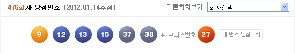 URL복사 기사공유하기 스크랩 프린트 메일보내기 글씨키우기 로또 476회 추첨 결과 1등이 4명 발표됐다.1월 14일 로또 추첨 결과, 1등 당첨번호는 '9, 12, 13, 15, 37, 38'다. 2등 보너스 번호는 '27' 이다. 한편 로또 476회 1등 4명에게는 1인당 34억3,985만1,469원이 당첨금액이 지급된다.(로또 당첨 번호 사진-네이버) 저작권자 © 소비자가 만드는 신문 무단전재 및 재배포 금지 온라인 뉴스팀 다른기사 보기 URL복사 기사공유하기 주요기사 고장 원인 못찾아 서비스센터 들락날락...반복 수리 피해는 소비자 몫 미래에셋·한투·삼성증권 등, 절세계좌 고객 유치 경쟁 치열 개포우성6차 재건축, GS건설-HDC현산 양강 경쟁으로 압축 정신아 카카오 대표 연임?...실적 '합격점', 이용자 신뢰 '낙제점' 삼성카드, 신용판매 점유율 2위 ‘껑충’...신한카드 턱밑 추격 현대로템·빙그레·SK가스 등 15곳 밸류업 계획 공시 '감감무소식'