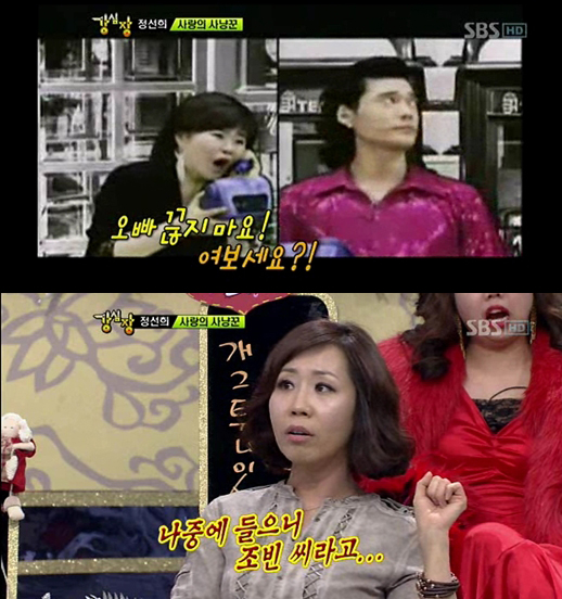 지난 10일 방송된 강심장에 출연한 정선희는 개그우먼 김효진과 함께 발매한 '사랑의 사냥꾼' 뮤직비디오를 소개하면서 "처음 봤을 때는 몰랐는데 나중에 들으니 노라조의 조빈이라고 하더라"고 말했다.