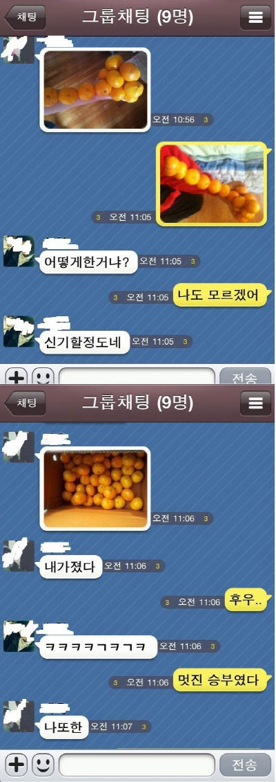 이들은 서로 많은 양의 귤을 쌓아 올리던 중 결국 귤 한 상자의 사진을 올린 친구의 사진을 보며 "내가졌다. 멋진 승부였다"고 패배를 인정했다.