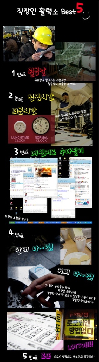 재미있는 사진과 함께 덧붙여진 설명을 읽다보면 직장인들의 공감을 충분히 이끌어낼 만한 내용의 활력소 BEST 5가 1위부터 5위까지 차례대로 나열돼 있다.
