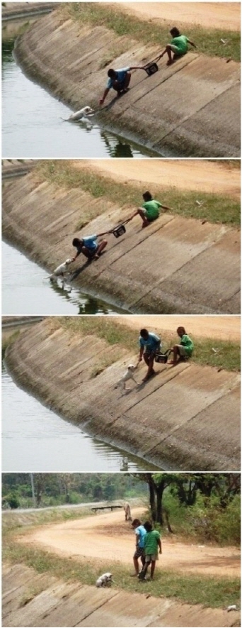 사진 속 소년들은 가방을 중심으로 한 소년은 땅을 지탱하고 또 다른 소년은 물에 빠진 개의 다리를 이끌어 무사히 개를 구조했다.