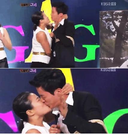 허경환은 김혜선에게 입술을 빼앗기자 "안할란다"라며 거부 의사를 밝혔으나 뜻대로 되지 않아 방청객들의 폭소를 자아냈다. (사진-KBS 방송 캡처)