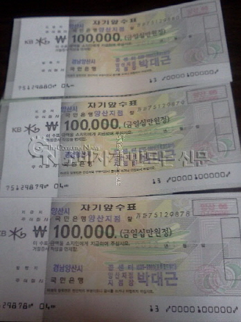 18일 경남 양산시 중부동에 사는 이 모(남.28세)씨에 따르면 그는 지난 일요일 국민은행 ATM기에서 발행한 수표 10만원권 3장에서 이상한 점을 발견했다.
