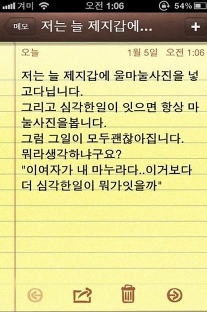 최근 한 온라인 커뮤니티 게시판에 올라온 이 '남편 지갑 속 비밀' 게시물에 담긴 내용은 “저는 늘 제지갑에 울마눌 사진을 넣고 다닙니다. 그리고 심각한 일이 있으면 항상 마눌사진을 봅니다, 그럼 그일이 모두 괜찮아집니다”라는 내용이다.