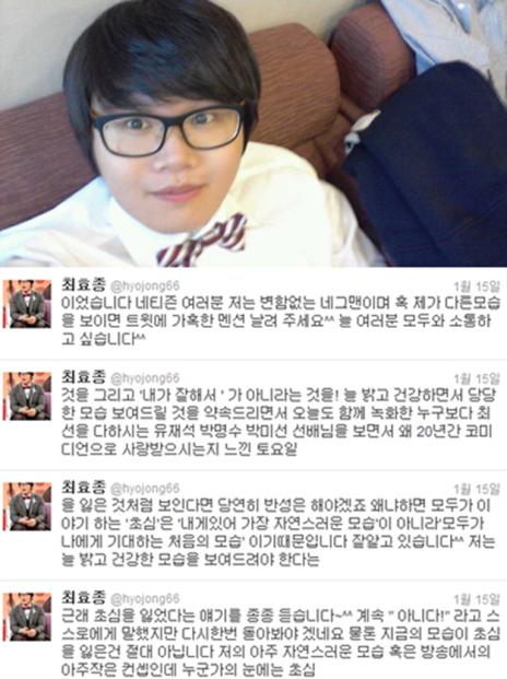 최효종은 15일 자신의 트위터에 "근래 초심을 잃었다는 얘기를 종종 듣습니다. 물론 지금 초심을 잃은건 아닙니다. 제가 방송에서 보인 아주 작은 컨셉들이 누군가의 눈에는 초심을 잃은 것처럼 보인다면 당연히 반성은 해야겠죠”라는 글을 올렸다.