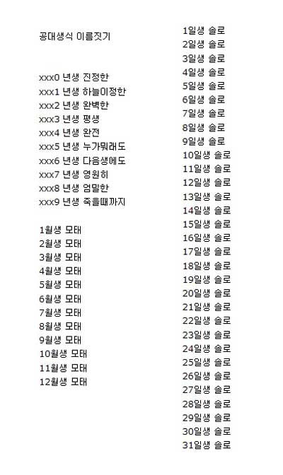 얼핏 평범해 보이는 이 이름 짓기의 시작은 월과 일 부터다. 1월부터 12월까지 모두 ‘모태’, 1일부터 31일까지 모두 ‘솔로’인 것이다.