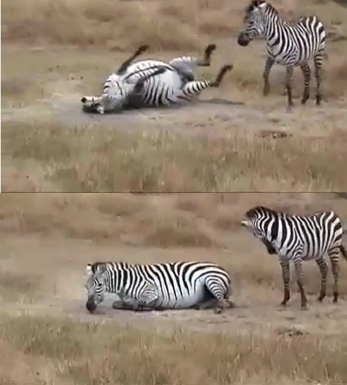얼룩말 몇 마리가 갑자기 털썩 주저 앉아 배를 드러내 보이며 땅에 등을 마구 부비고 있는 장면이다.