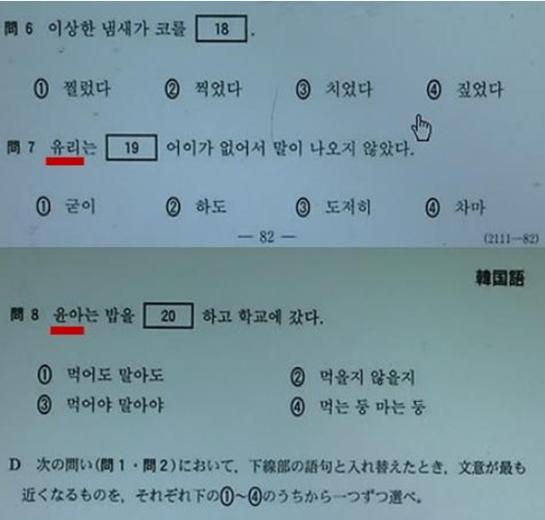 소녀시대의 이름이 나온 문제는 ‘유리는 ( ) 어이가 없어서 말이 나오지 않았다’와 ‘윤아는 밥을 ( ) 하고 학교에 갔다’라는 문장에 등장했다.